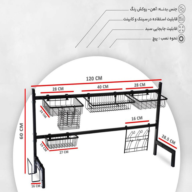 آبچکان مدل ۱۲۰ سانتی متر یکی از کامل ترین و مجهزترین لوازم آشپزخانه می باشد. وجود این محصول در آشپزخانه بسیار ضروری و پرکاربرد می باشد. درون آشپزخانه به یک آبچکان برای خشک شدن ظرف های شسته احتیاج می باشد که به طور معمول آن را بالای ظرفشویی نصب می کنند ولی برخی آشپزخانه ها به گونه ای طراحی شده اند که ظرفشویی آنها پشت پنجره قرار گرفته و فضایی برای قرار دادن آبچکان دیواری ندارد که در این صورت استفاده از آبچکان های میزی مناسب می باشد که معمولا آنها فضای کافی برای قرار دادن ظروف زیاد را ندارند. در طراحی این محصول که در حال معرفی آن هستیم تمام این موارد مد نظر قرار گرفته و دارای بخش های مختلفی است که می توان انواع مختلف ظروف را در قسمت های آن به طور مجزا قرار داد و به راحتی آنها را نظم داد. به همین دلیل جزو نظم دهنده آشپزخانه محسوب می شود و مناسب قرار دادن پشت شیر آب ظرفشویی است و به خوبی در آن فضا جای می گیرد.