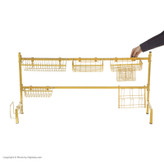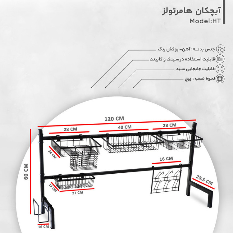 آبچکانها آن دسته از تجهیزاتی هستند که وجود آنها در هر آشپزخانهای بسیار لازم و ضروری است. این محصولات باعث برقراری نظم و زیبایی در آشپزخانه شده و باعث افزایش سرعت خشک شدن ظروف نیز میشود. محصولی که مشاهده میکند آبچکان هامرتولز مدل Ht است که از مدل آبچکان بالای سینک آشپزخانه و آبچکان رومیزی است. این محصول از سری آبچکان جدید است که پشت پنجرهای بوده و طراحی به روزی دارد و فضای مدرنی به آشپزخانه میبخشد. جنس آبچکان هامرتولز مدل Ht از آهن و با رنگ الکترو استاتیک کوره ای ضد زنگ و ضد خط و خش است. این استند شامل : 1- یک سبد جاظرفی مناسب بشقاب ، پیش دستی ، در قابلمه ، دیس 2- دو سبد مربعی مناسب قابلمه ، کاسه ، میوه 3- یک سبد جای مایع و اسکاچ 4-یک استند لیوان برای نگهداری انواع لیوان با سایزهای مختلف 5- استند جای سینی 6-یک سبد آویزان برای جای قاشق و چنگال است. قیمت آبچکان رومیزی هامرتولز مقرون به صرفه است، اگر در آشپزخانه شما کابینت آبچکان ندارد این محصول بهترین گزینه برای خرید است.